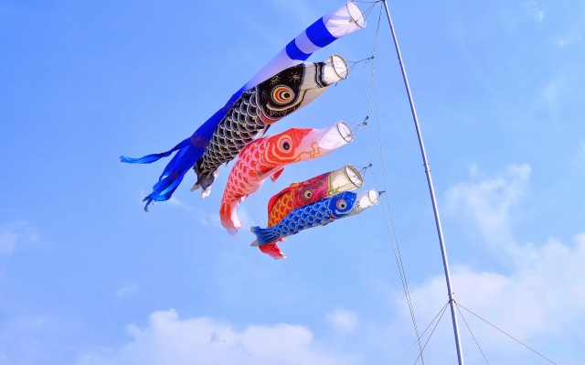 こどもの日には 「こいのぼり」を あげます。 「こいのぼり」とは 鯉という 魚の 形を した 旗です。 昔話で 鯉が 滝を 登ったと いわれているので、 「こいのぼり」には 鯉の ように 元気に 育って ほしい という 願いが あります。 家の庭 などに こいのぼりを 飾る ことが あります。
