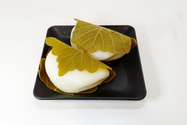 こどもの日に 食べる お菓子と いえば、 「かしわもち」が あります。 「かしわもち」は 柏の 葉で おもちを 包んだ ものです。 柏の 葉は 長い間 木から 落ちないので、 「かしわもち」を 食べることは 長生きする という 願いが あります。
